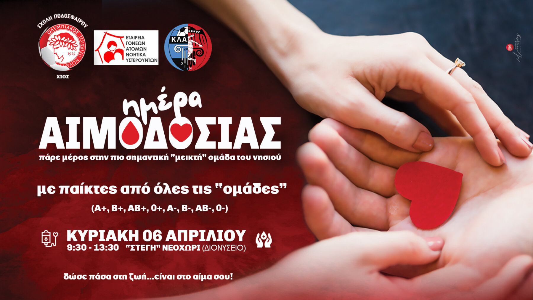 Η Εταιρεία Γονέων Ατόμων Νοητικά Υστερούντων σε συνεργασία με την Ακαδημία ποδοσφαίρου του Ολυμπιακού Χίου – Κλασσικού, διοργανώνει εθελοντική αιμοδοσία 🩸 στις εγκαταστάσεις της στο Νεχώρι και ώρες 09:30-13:30.