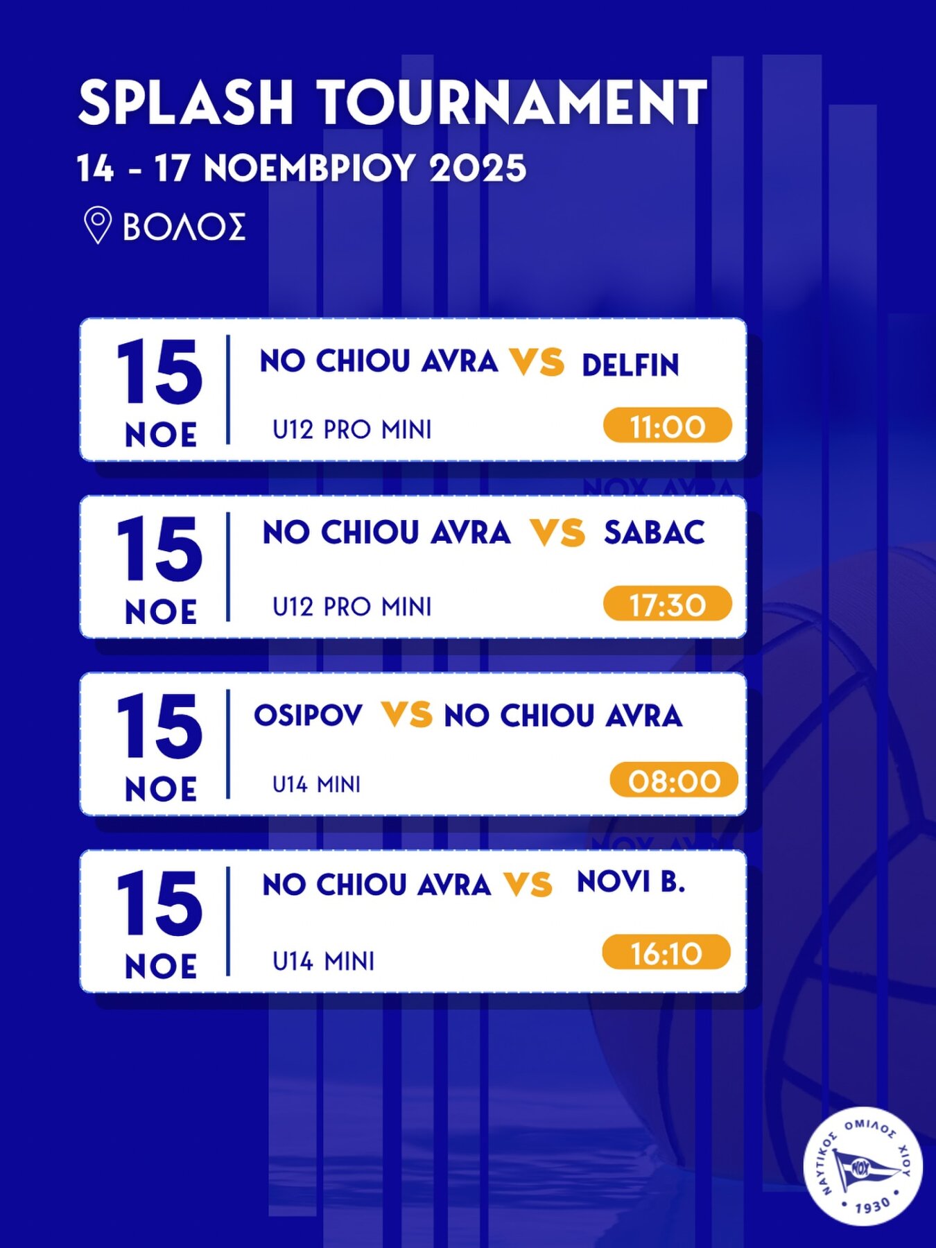 Από τις 14 έως 17 Νοεμβρίου οι ομάδες Προ Μίνι και Μίνι Παίδων του ΝΟ Χίου ΑΥΡΑ θα συμμετάσχουν στο διεθνές τουρνουά υδατοσφαίρισης SPLASH που διοργανώνεται στον Βόλο!