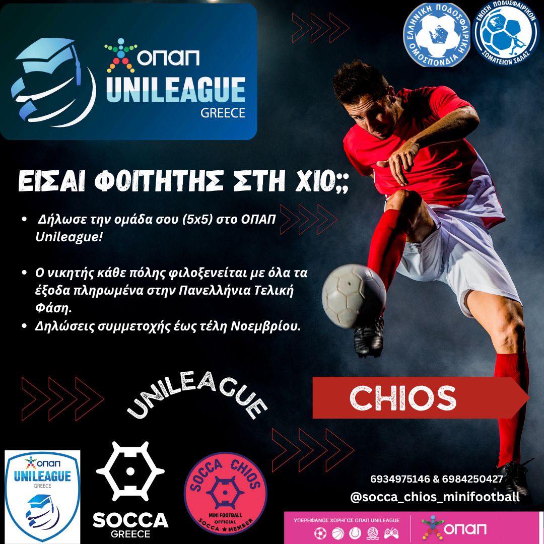 Είσαι φοιτητής; Ήρθε η ώρα να μπεις στο παιχνίδι!Το ΟΠΑΠ Unileague, υπό τη Socca Greece και τη Socca Chios, σε περιμένει! Δήλωσε την ομάδα σου, μπες στη δράση και κέρδισε το εισιτήριο για την 🇬🇷Πανελλήνια Τελική Φάση του Μαΐου — με όλα τα έξοδα πληρωμένα!