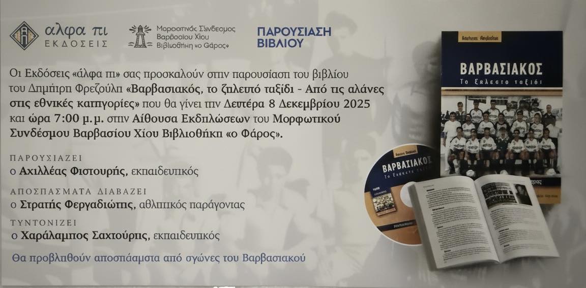 «Βαρβασιακός, το ζηλευτό ταξίδι, από τις αλάνες στις εθνικές κατηγορίες» τη Δευτέρα 8 Δεκεμβρίου 2025 και ώρα 7:00 μμ στην αίθουσα εκδηλώσεων του Φάρου Βαρβασίου. Το βιβλίο θα παρουσιάσει ο εκπαιδευτικός Αχιλλέας Φιστουρής, ενώ αποσπάσματα θα διαβάσει ο αθλητικός παράγοντας Στρατής Φεργαδιώτης. Θα συντονίσει ο εκπαιδευτικός Χαράλαμπος Σαχτούρης. Θα προβληθούν αποσπάσματα από αγώνες του Βαρβασιακού, ενώ την εκδήλωση θα τιμήσουν με την παρουσία τους παράγοντες της ομάδας.