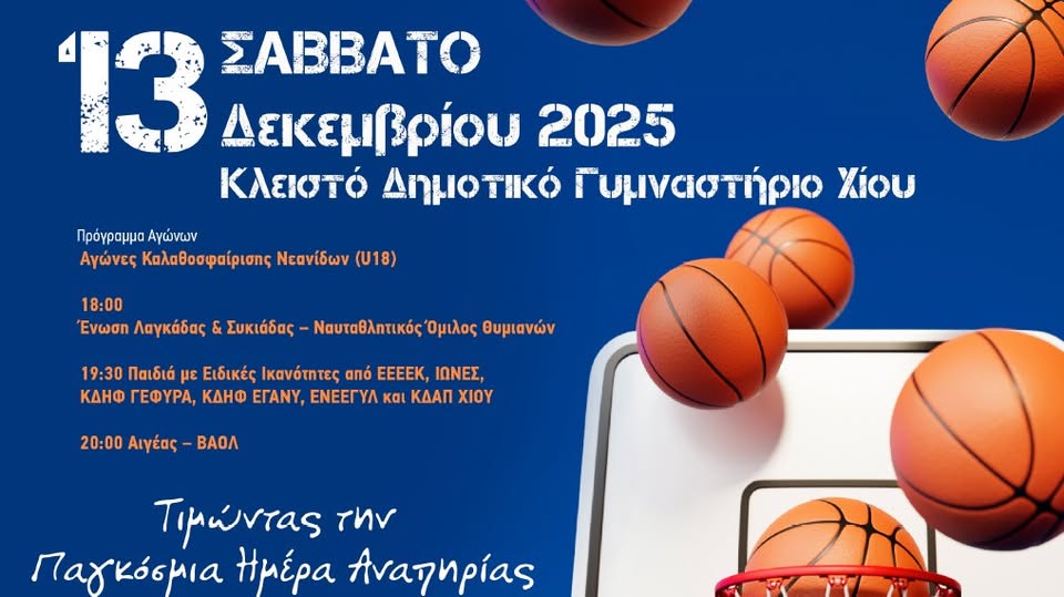 Ο Σύλλογος Γονέων Κηδεμόνων και Φίλων Ατόμων με Αυτισμό Χίου και η Τοπική Επιτροπή της Ελληνικής Ομοσπονδίας Καλαθοσφαίρισης Χίου, στα πλαίσια των δραστηριοτήτων τους και με αφορμή την Παγκόσμια Ημέρα Ατόμων με Αναπηρία, συνδιοργανώνουν ένα τουρνουά αγώνων καλαθοσφαίρισης.
