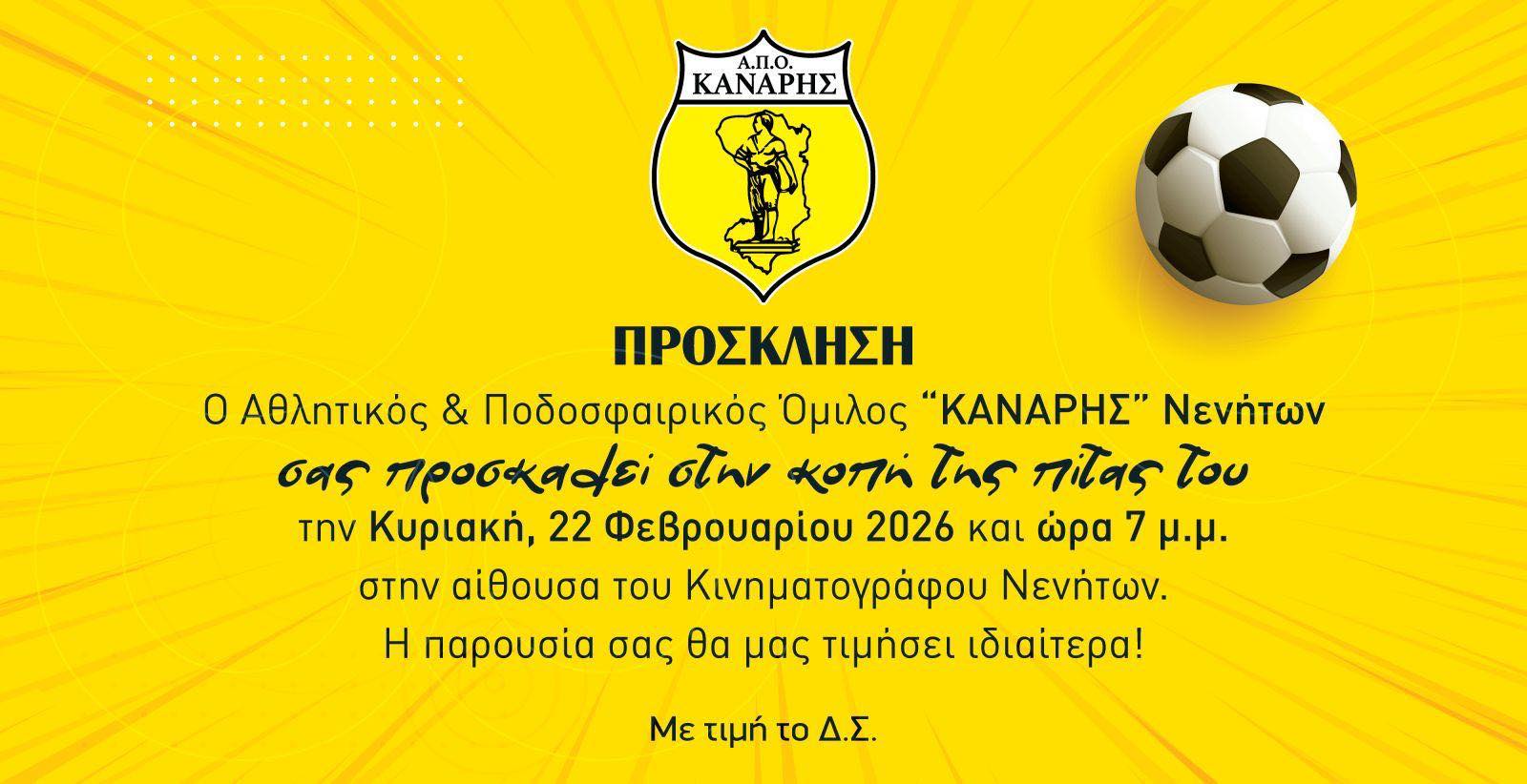 Στην αίθουσα κινηματογράφου στα Νένητα ο Κανάρης θα πραγματοποιήσει τη κοπή της πρωτοχρονιάτικης πίτας την ερχόμενη Κυριακή (22/02).