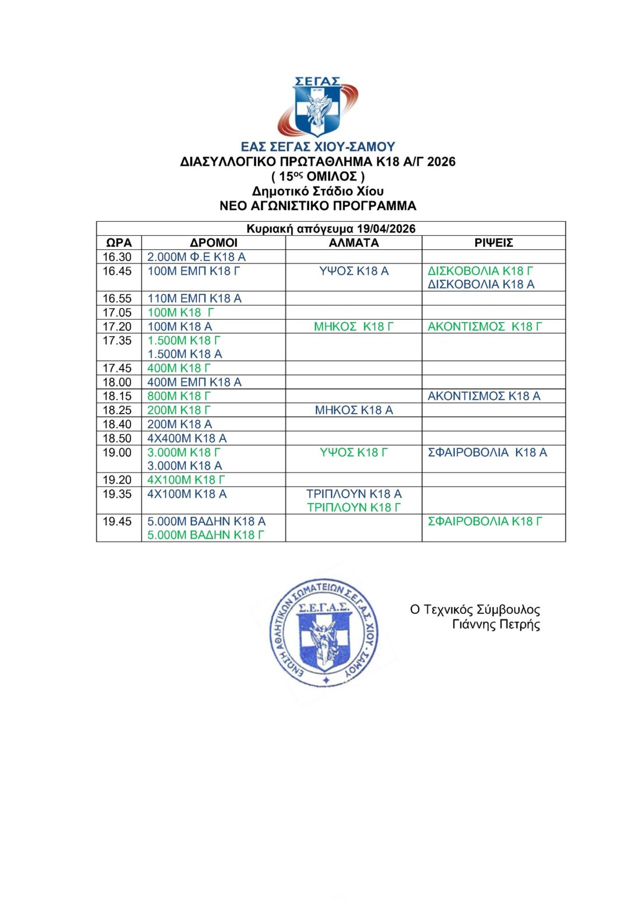 Την Κυριακή 19 Απριλίου 2026 θα διεξαχθεί στο Δημοτικό Στάδιο της Χίου το Διασυλλογικό πρωτάθλημα στίβου Κ18!