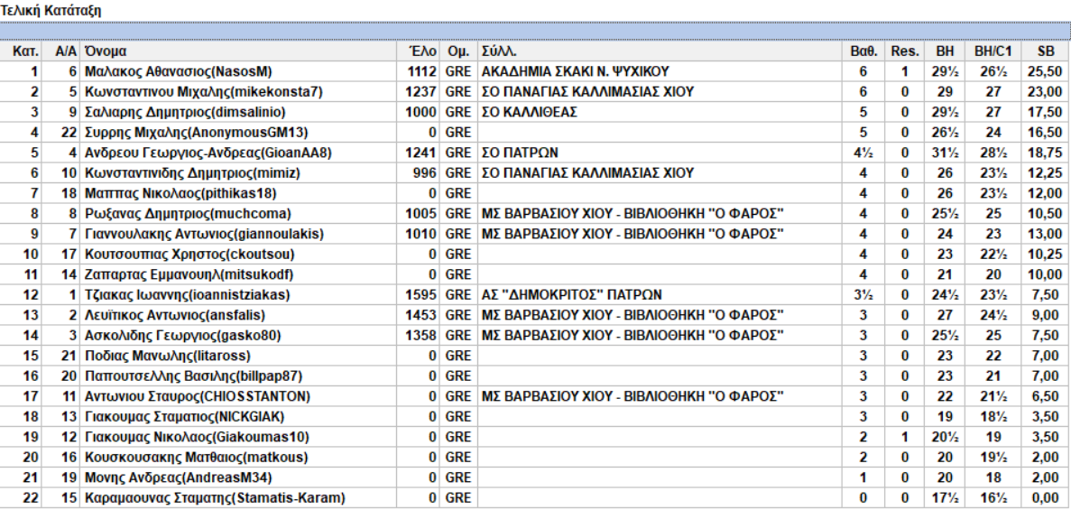Τρίτος στην γενική κατάταξη τερμάτισε ο Σαλιάρης Δημήτριος με 5/7, με τους ίδιους βαθμούς τερμάτισε και ο Συρρής Μιχαήλ, υστέρησε όμως στο 2ο κριτήριο ισοβαθμίας το Bucholz, το οποίο είναι το άθροισμα των βαθμών των αντιπάλων τους.